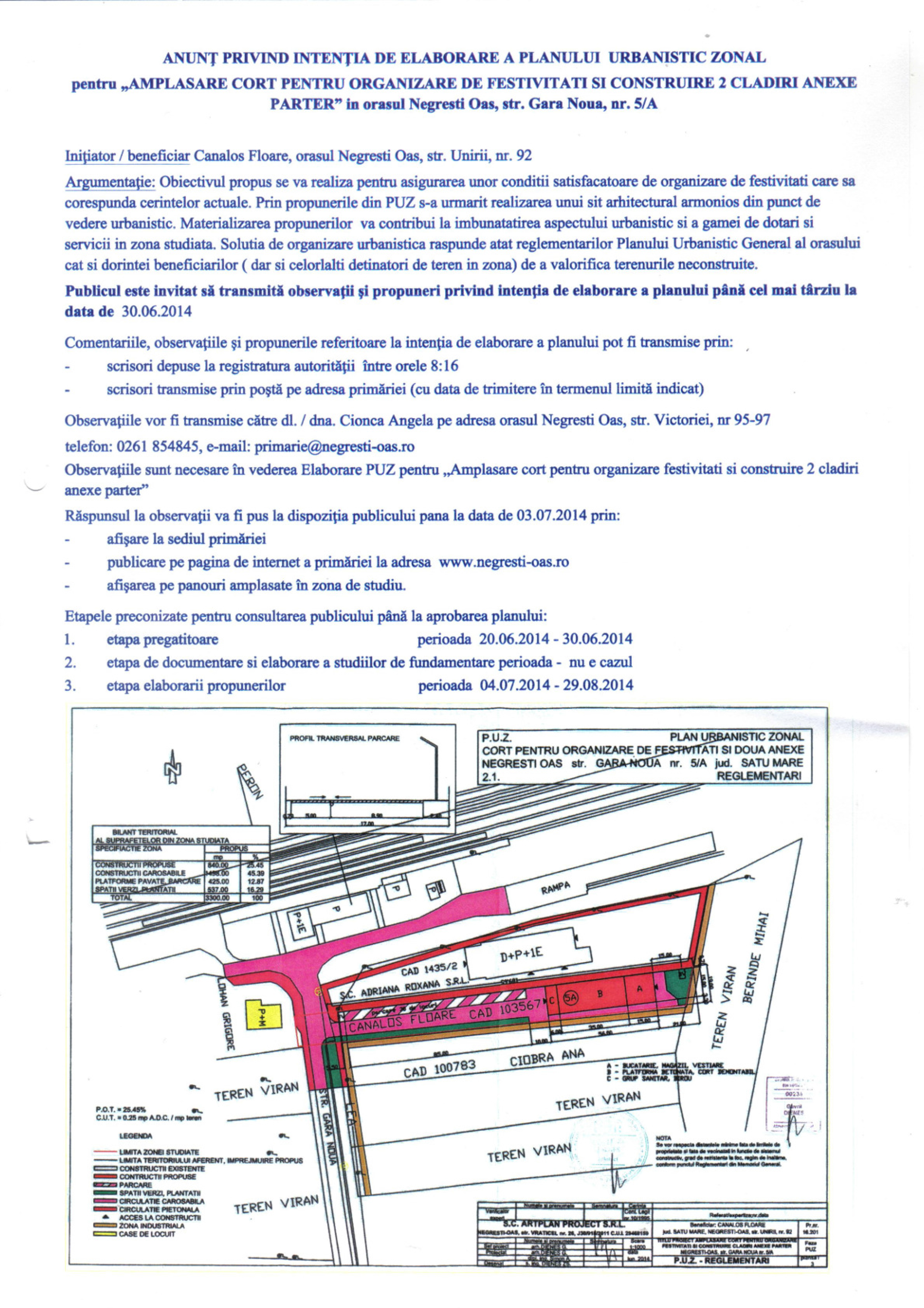 Anunţ privind intenţia de elaborare a Planului Urbanistic Zonal pentru „Amplasare cort pentru organizarea de festivităţi şi construire 2 clădiri anexe parter” în oraşul Negreşti-Oaş, str. Gara Nouă nr. 5/A