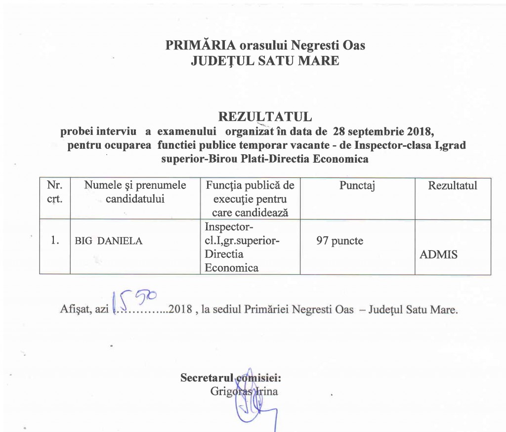 Rezultatele finale ale concursului organizat în data de 28 septembrie 2018 pentru ocuparea funcțiilor publice temporar vacante – de Inspector – clasa I, grad superior – Birou Plăți – Direcția Economică, respectiv funcția publică temporară vacantă de Inspector, clasa I, grad principal SPCLEP, din cadrul Primăriei Orașului Negrești-Oaș